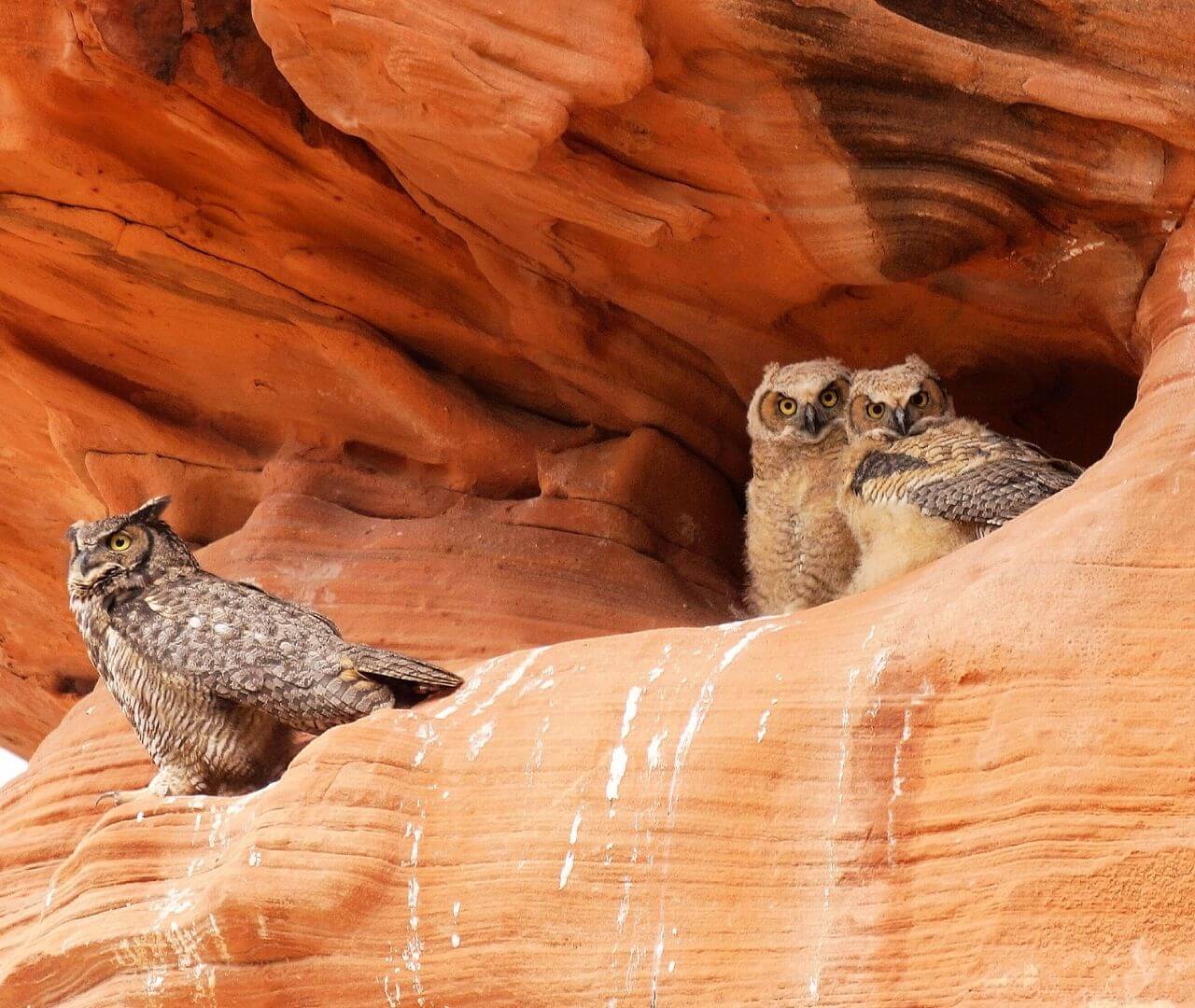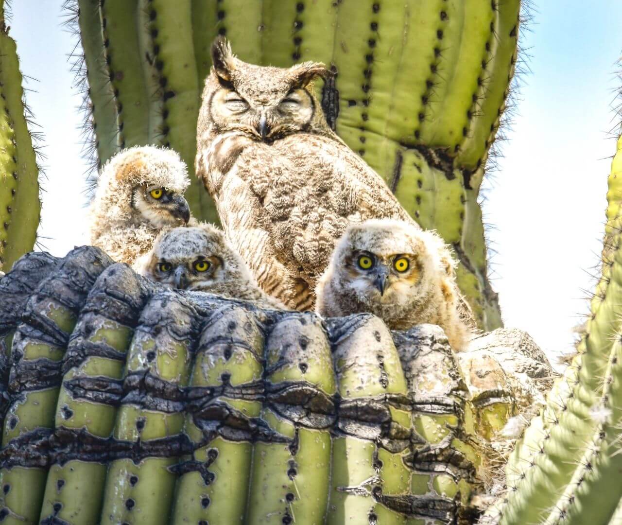 Great horned owls will generally nest in large trees, but may also nest on cliff edges, abandoned buildings, or even saguaro cacti! They often use nests leftover from hawks or other large birds, which makes their nest-building job a little easier. Once a great horned owl finds a mate, usually by hooting, they will perform some bonding dances and lay up to 4 eggs in their nest. Both males and females will help care for the chicks until they are ready to go out and hunt on their own!