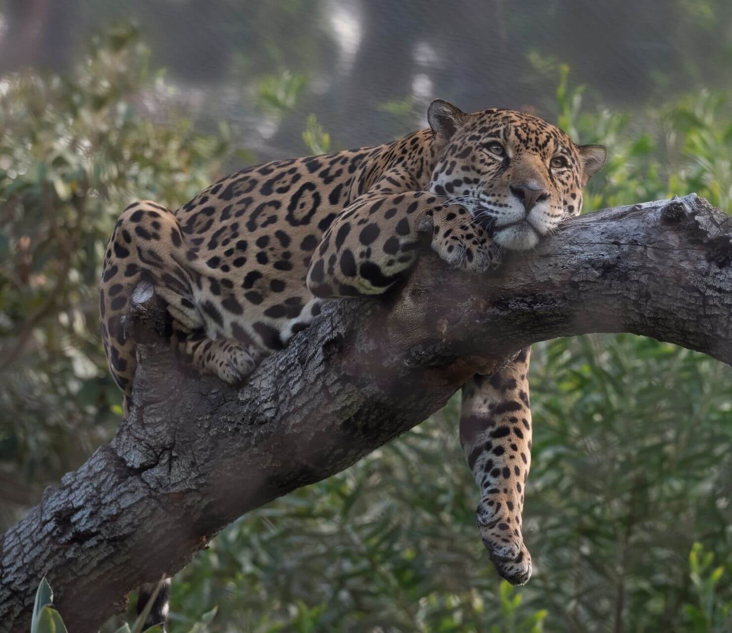 Jaguars are mostly active during dusk and night time, but they are observed being active during many different parts of the day. When they are not hunting or moving between habitats, they can be found resting hidden in vegetation, in caves, or up in the trees.