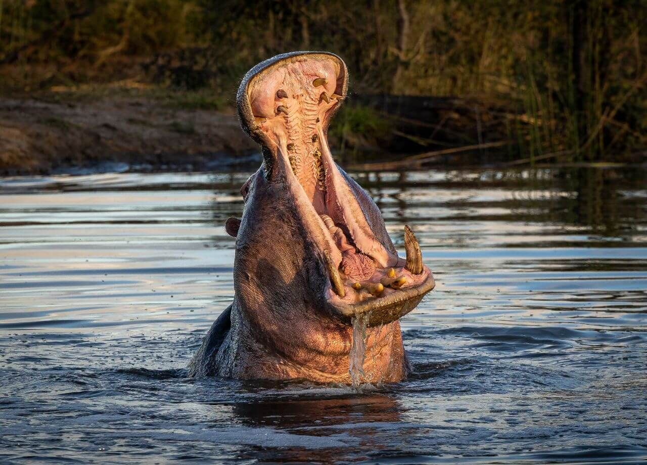 The common hippopotamus is a large animal with a large impact on the savannas of Africa. Hippopotamuses are one of the largest mammals on land. Large males weigh more than 3,000 lbs! While hippopotamuses spend most of their time in rivers, lakes, and ponds, they leave the water at night to feed on grasses. Their herbivorous diet might surprise you once you see their large, sharp teeth, but those are not used for eating. Hippopotamuses are very territorial. They use their large teeth to intimidate other hippopotamuses and predators. Because of their territorial nature, hippopotamuses are considered one of the most dangerous animals in Africa.