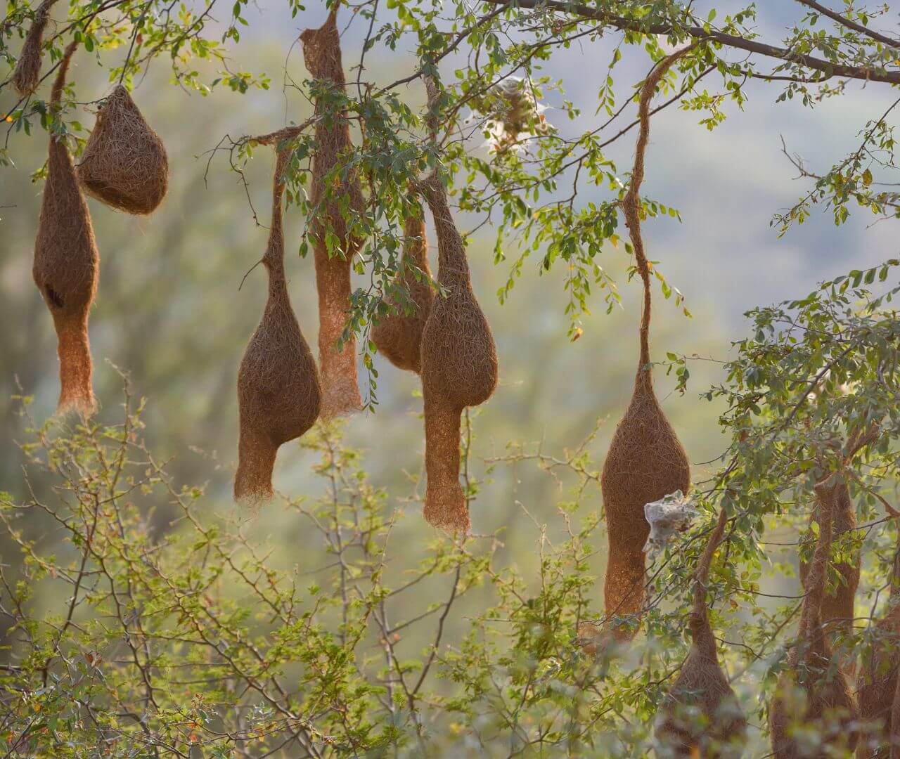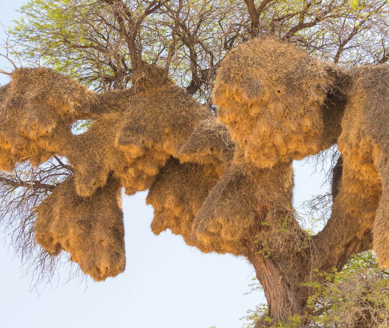 Weaverbirds are a large family of songbirds (more than 100 species!) that are native to Africa and Asia. These small birds are named for their ability to weave leaves, grass, twigs, and other materials into intricate nests. Many species make nests that look like hanging baskets with a downward-facing entrance. Some species, like the sociable weaver, build their nests together in large structures that act like bird apartment buildings. Up to 300 sociable weaver pairs can be found in a single nest! For many species of weaverbirds, males build the nest and use it to attract a mate. Like in many bird species, some weaverbird species are brightly colored, while females tend to be duller. In some weaverbird species, males will become brighter only during the breeding season. If the female is wooed by the male's bright colors and nest-building skills, she will move in to mate, lay her eggs, and raise her chicks in the nest.
