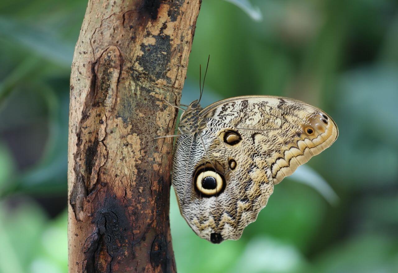 Owl butterflies, also known as Caligo butterflies, get their name from the huge eyespots on their wings that look like owl eyes! By tricking predators into thinking they are large owls, they often avoid being eaten. Owl butterflies spend lots of time drinking the juices of rotting fruits in the rainforests of Central and South America. They generally look for fruit at dusk when fewer birds are out hunting. Because of their large size (up to 8-inches long), they are poor fliers and can only fly a few feet at a time, making them easy prey!