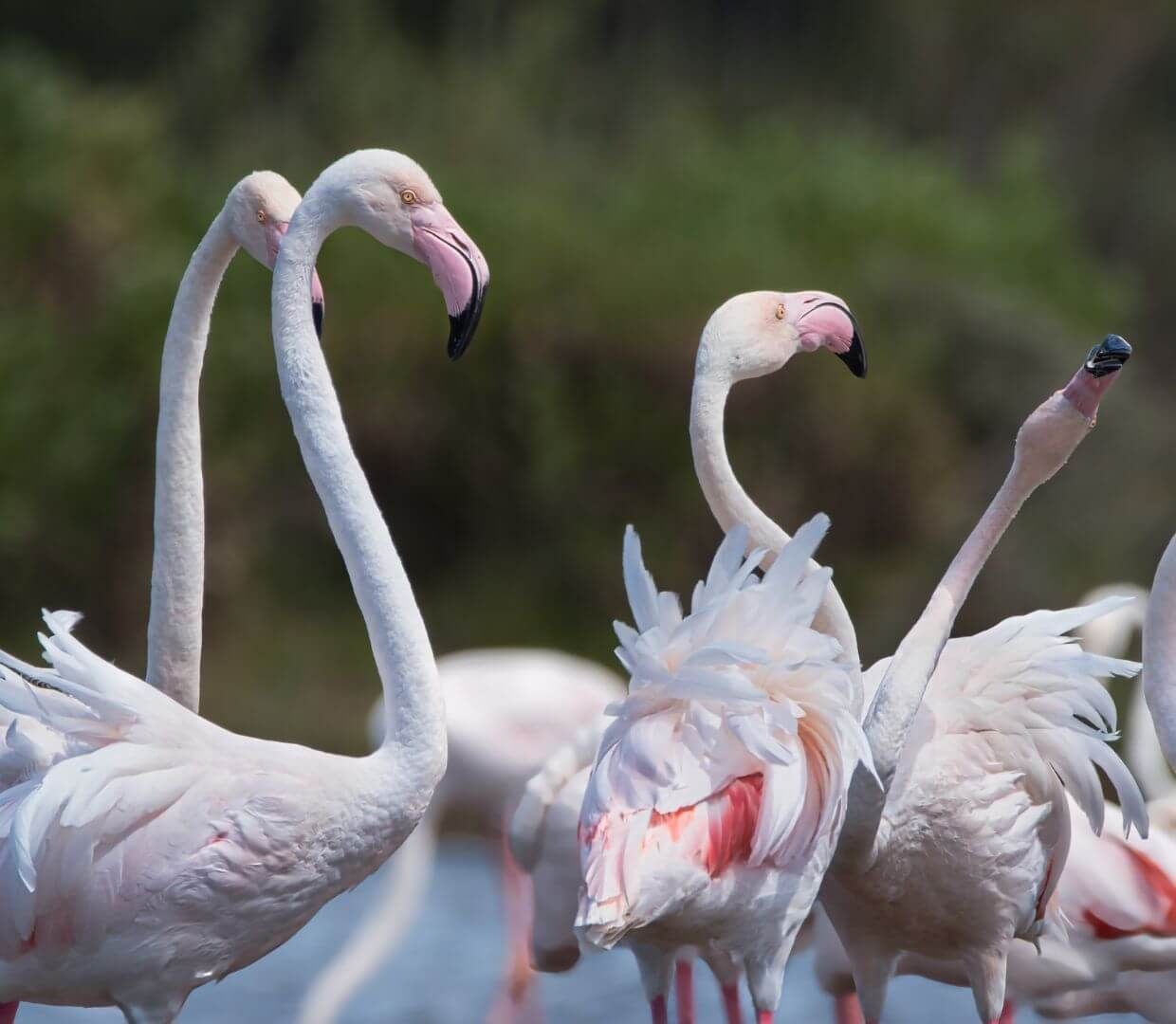Greater flamingos are the tallest of the six species of flamingos. They stand more than 5 feet tall. They also have the largest range of any flamingo. They are found in many coastal areas of Africa, Europe, and western Asia.