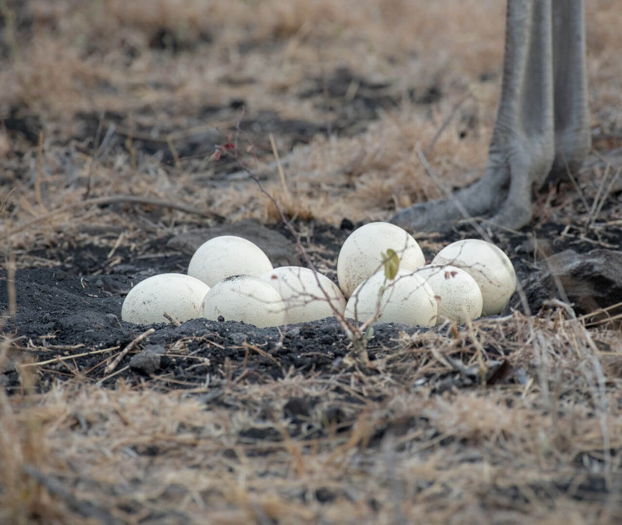 After breeding, all females in the group lay their eggs in one nest which is cared for by the dominant male and female. Females typically incubate during the day when their brown feathers are well camouflaged. Males typically incubate at night when their black feathers make them hard to see in the darkness. Females have incredibly smart strategies to make sure her eggs stay safe, like keeping her eggs in the center of the nest!