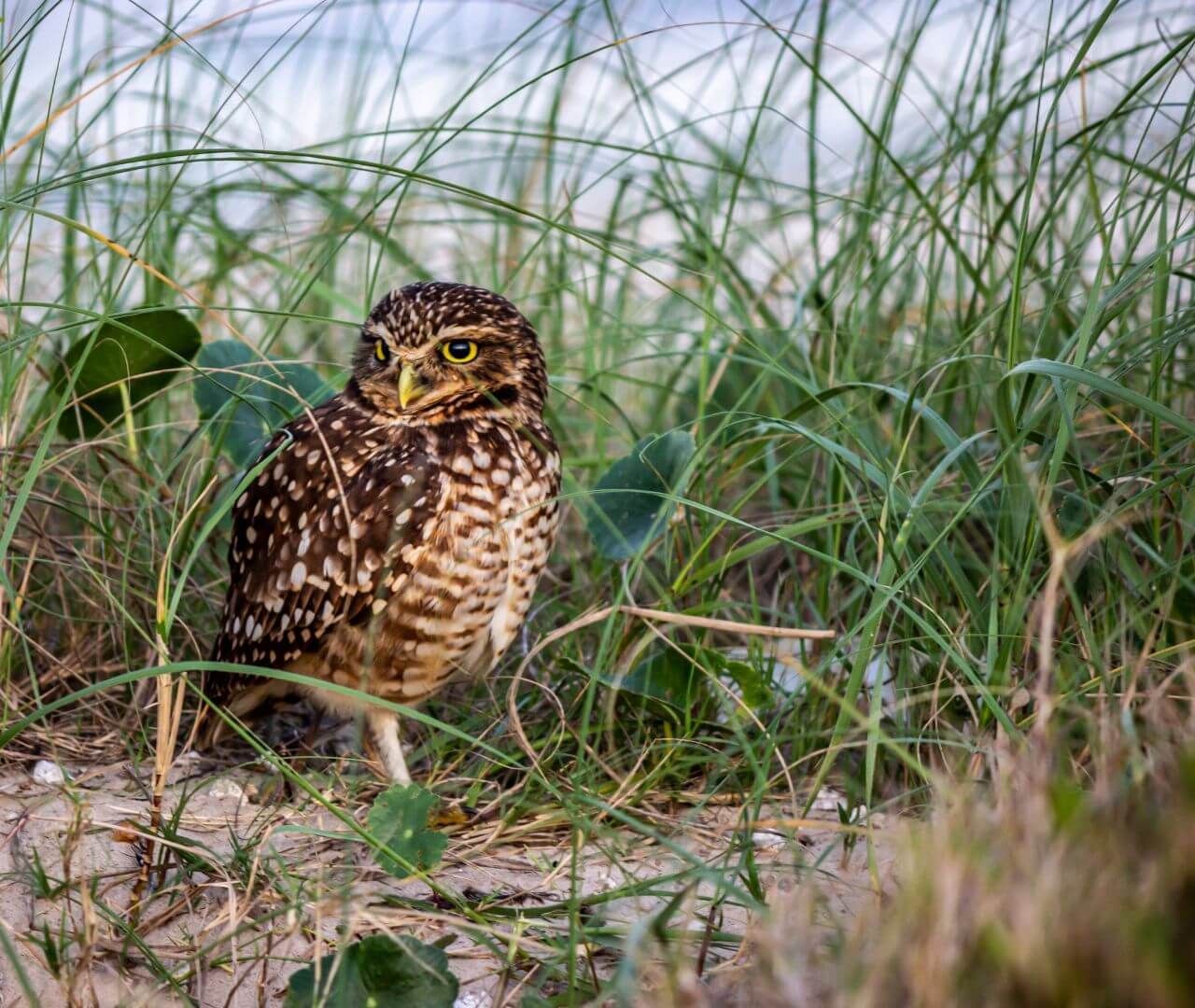 Burrowing owls are small compared to other owls. They are less than one foot tall. They have relatively long legs that help them look for prey and predators in tall grass. Burrowing owls take shelter in burrows when predators like hawks, snakes, and foxes approach. They mimic the sounds of rattlesnakes to warn predators to stay back.