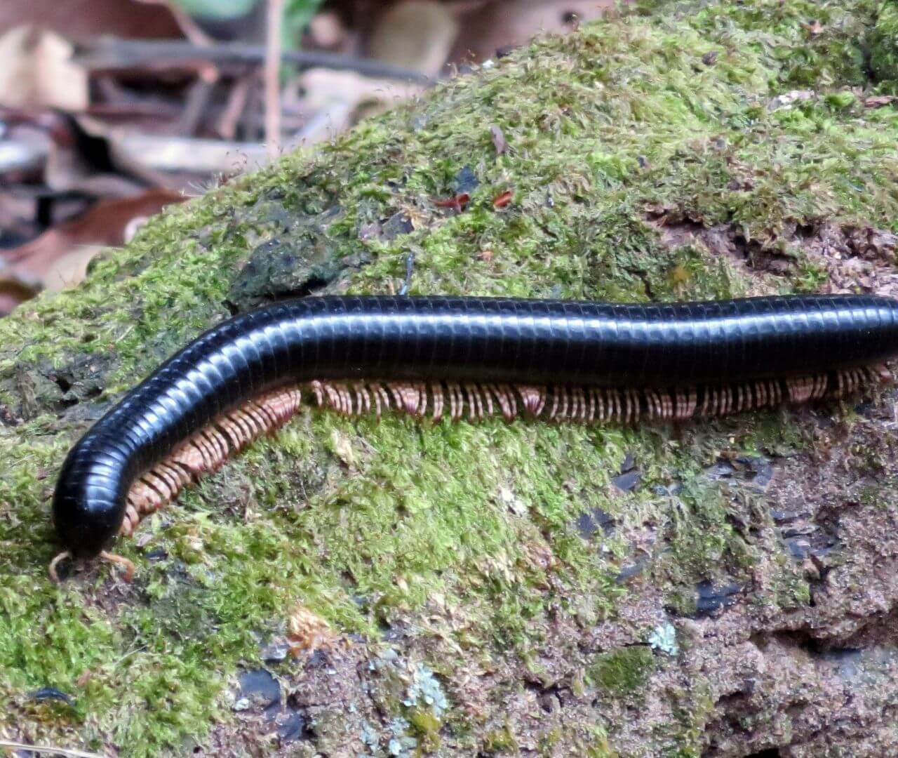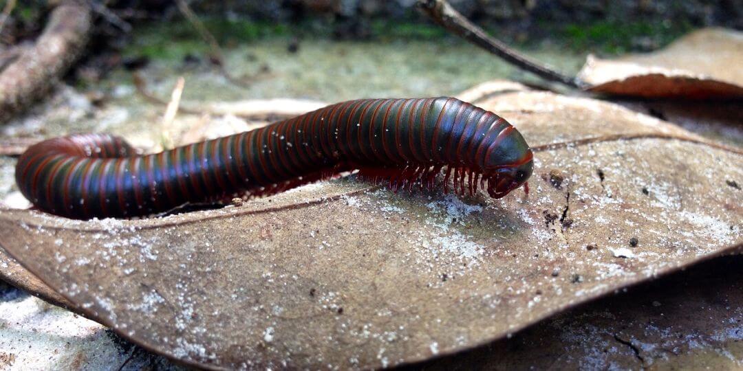 Of all 10,000 species of millipedes in the world, the giant African millipede is the largest; it can grow up to 1-ft long! These gigantic invertebrates live in the rainforests of Africa where they spend their days hiding under piles of leaves and feeding on dead matter. Like all millipedes, giant African millipedes are important in their ecosystem because they are detritivores.