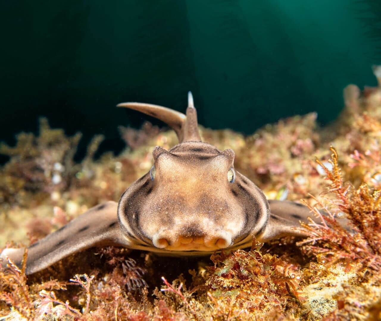 Horn sharks are a small species of shark found along the coast of California and Mexico! They measure about 3 feet long and can be identified using their polka-dot pattern. Adult horn sharks typically spend their time in shallow, rocky reefs or beds of algae while young horn sharks can be found in deeper, sandy areas. They are typically solitary and nocturnal, hunting around the home ranges at night time. Their powerful, crushing jaws allow them to feed on hard prey like mussels, snails, crabs, and sea urchins, but they will also eat fish and other invertebrates like octopuses!