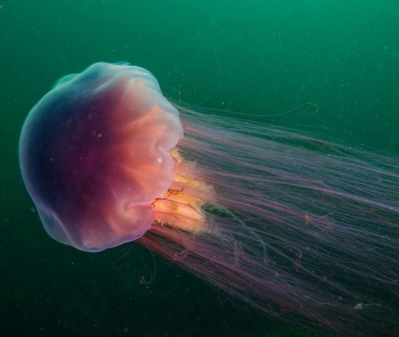 The lion’s mane jellyfish is one the largest jellyfish in the world. Its tentacles reach more than 100 feet long. That is longer than a blue whale! It has more than 1,000 tentacles hanging from its bell, giving it a fluffy appearance similar to a lion’s mane.