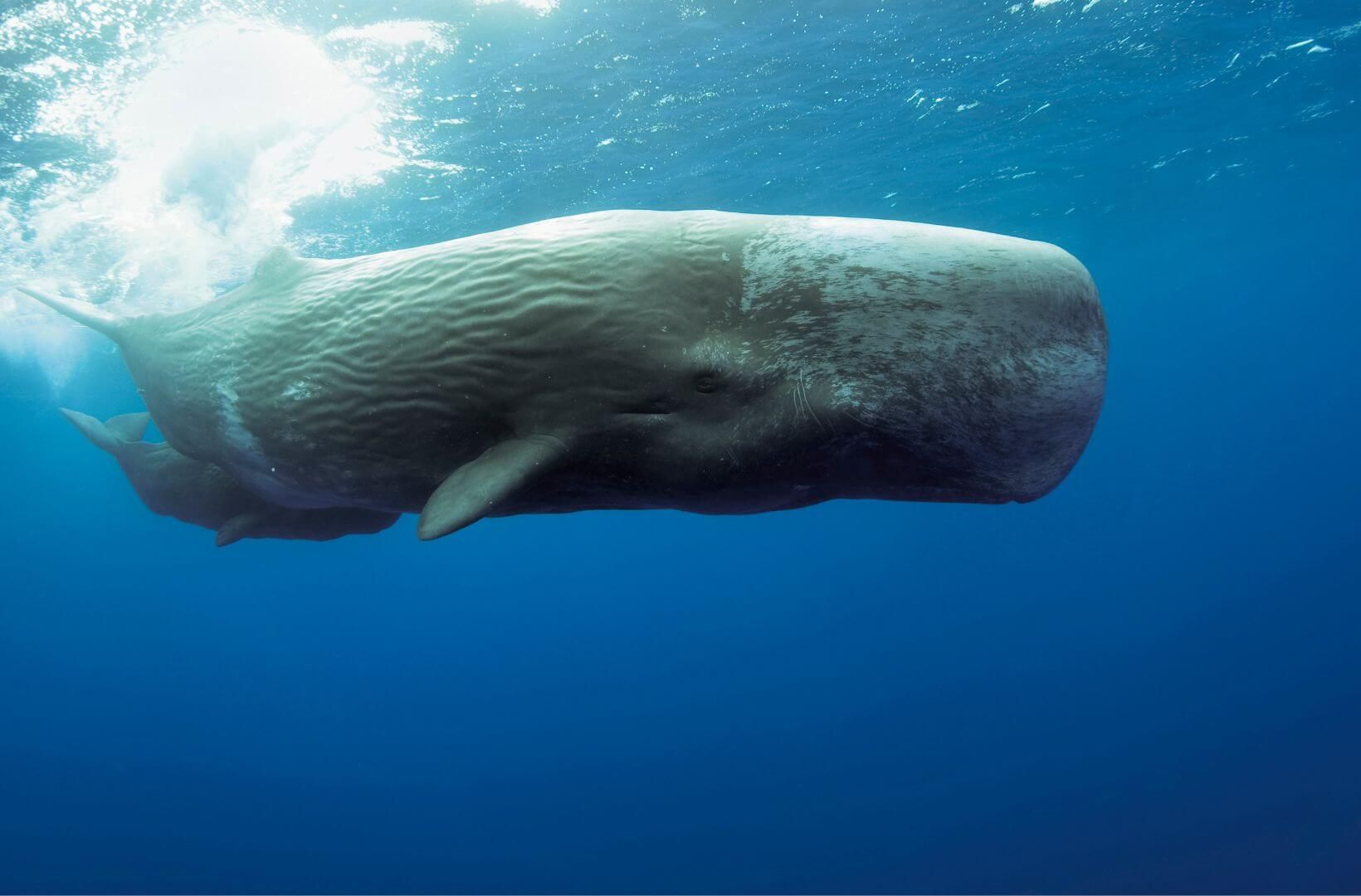 Not only do sperm whales excel in hunting and diving, they are also quite impressive singers. Sperm whales are arguably the loudest animal in the world. They produce a clicking sound that reaches 233 decibels (this is louder than a jet engine at takeoff!) that travels several hundreds of miles through the water. Different families of whales communicate using different types of vocalizations, proving that the sounds they make are learned. Like other toothed whales, they also use their vocalizations during echolocation. This allows them to hunt and navigate in dark ocean waters!