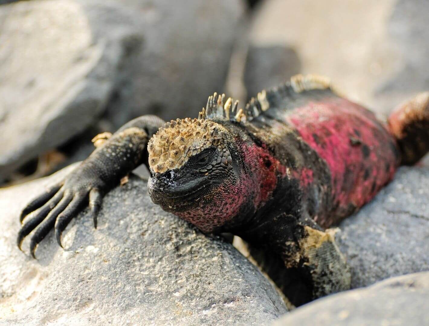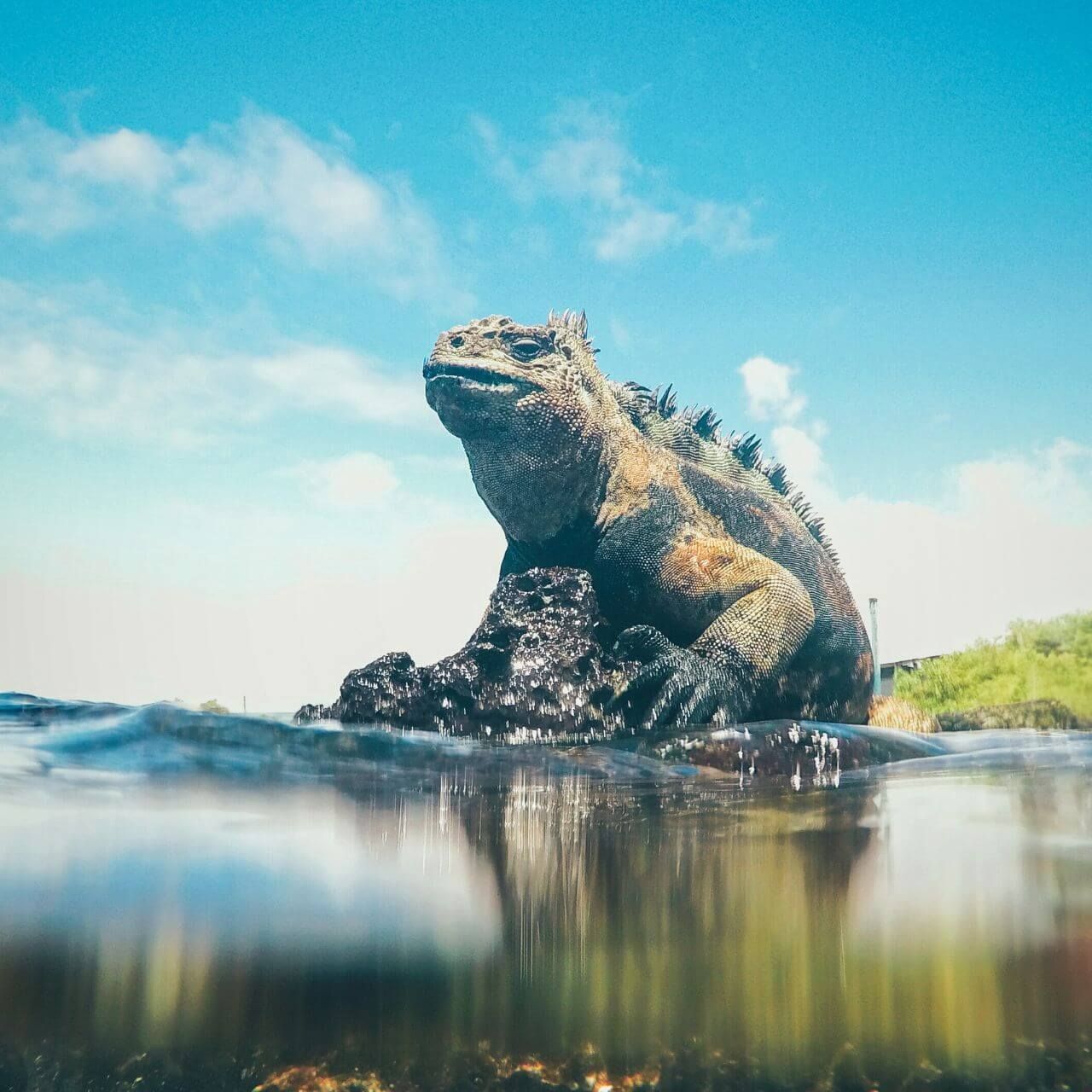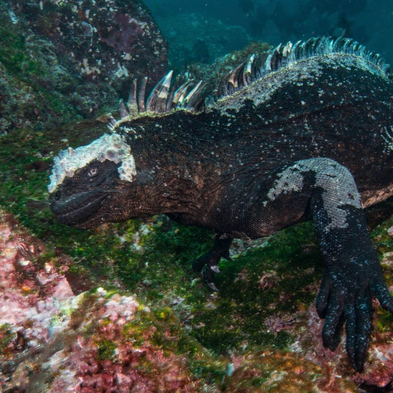 Marine iguanas are the only lizards in the world that find their food in the ocean. Their blunt snout scrapes algae off rocks along the seafloor or in the intertidal zone.
