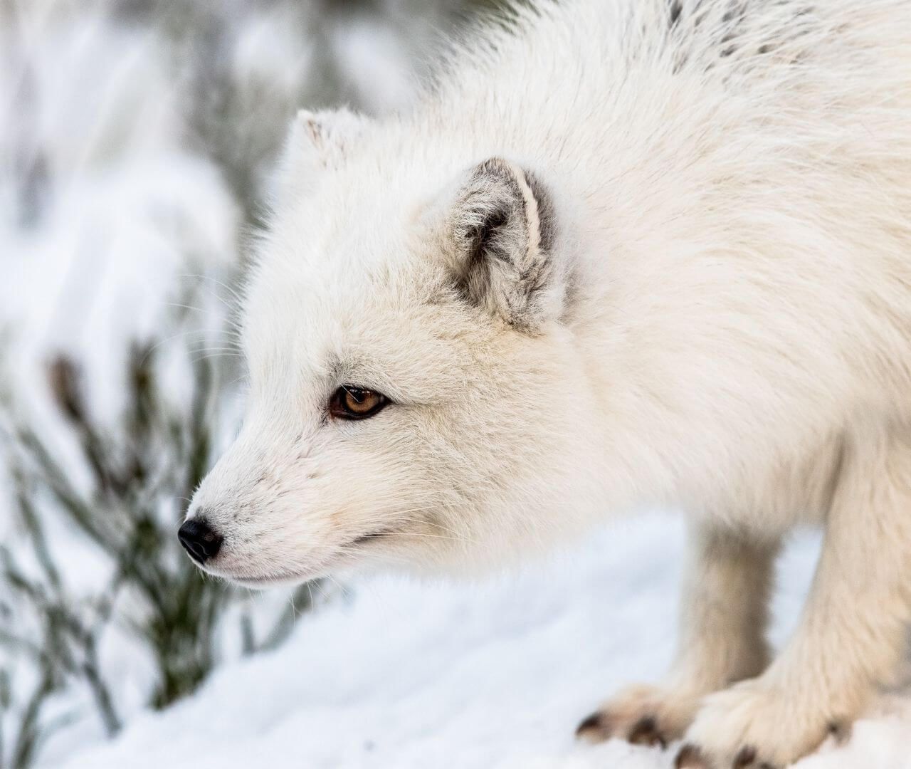The arctic fox is perhaps the cutest canine in the Arctic! With its small ears, short legs, and fluffy fur, it is perfectly designed for life in a freezing climate. Because heat can easily escape an animal's body from their legs and ears, arctic foxes have small ears and short legs to reduce heat loss. Perhaps the most amazing thing about an arctic fox is that they change color to match the landscape during different seasons. In the summer, they are brown to match the dry landscape and in the winter, their fur thickens and turns white to match the snow!